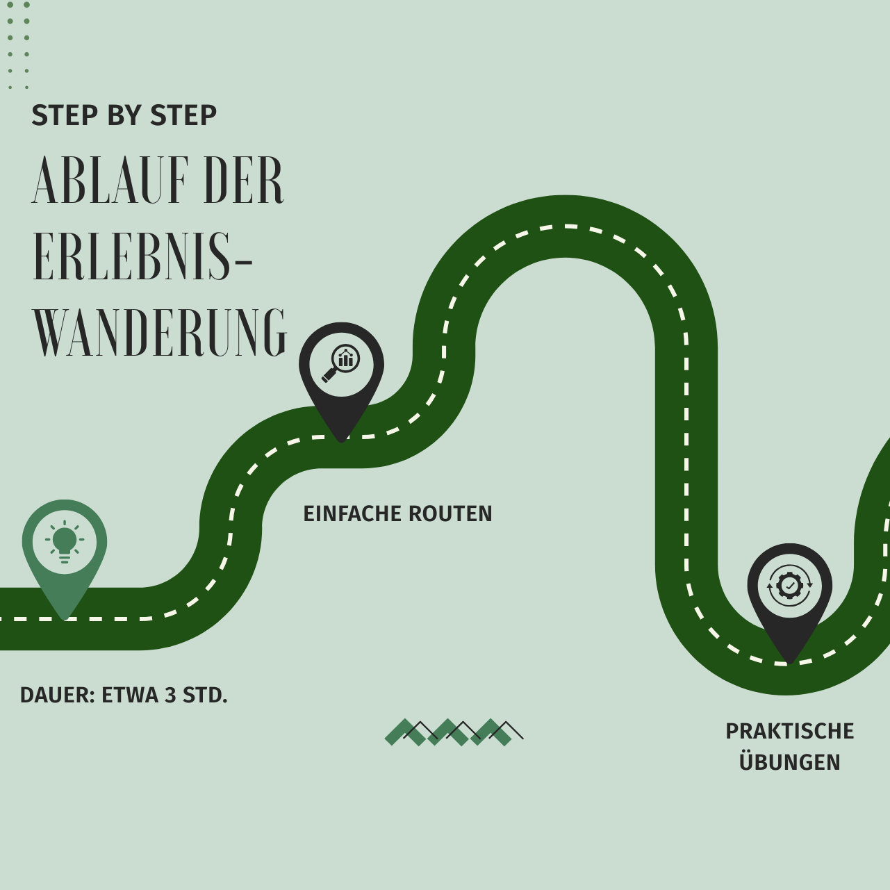 Die Wanderung dauert etwa 3,5 - 4 Stunden. Die Strecke ist einfach zu bewältigen und auch von Anfängern zu schaffen. Im Mittelpunkt steht die Bewegung, die Natur und du mit deinem Thema!